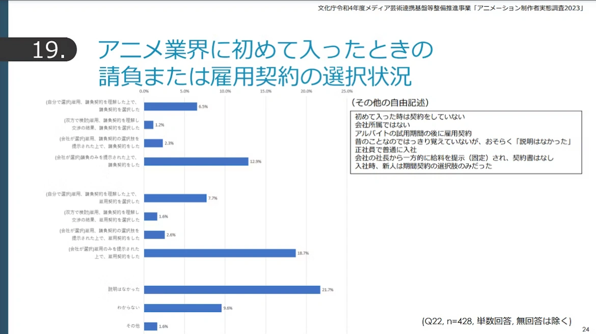 В отчёте JAniCA по аниме за 2023 год аниматоров спрашивали, какой им давался выбор при заключении первого трудового договора после начала работы в индустрии. Данные показали, что из 428 опрошенных аниматоров каждый пятый (21,7%) не был ознакомлен с условиями контракта при поступлении на работу, в результате чего они не знали о своих правах и могли подвергнуться эксплуатации. Это самый большой процентный показатель из отчёта.