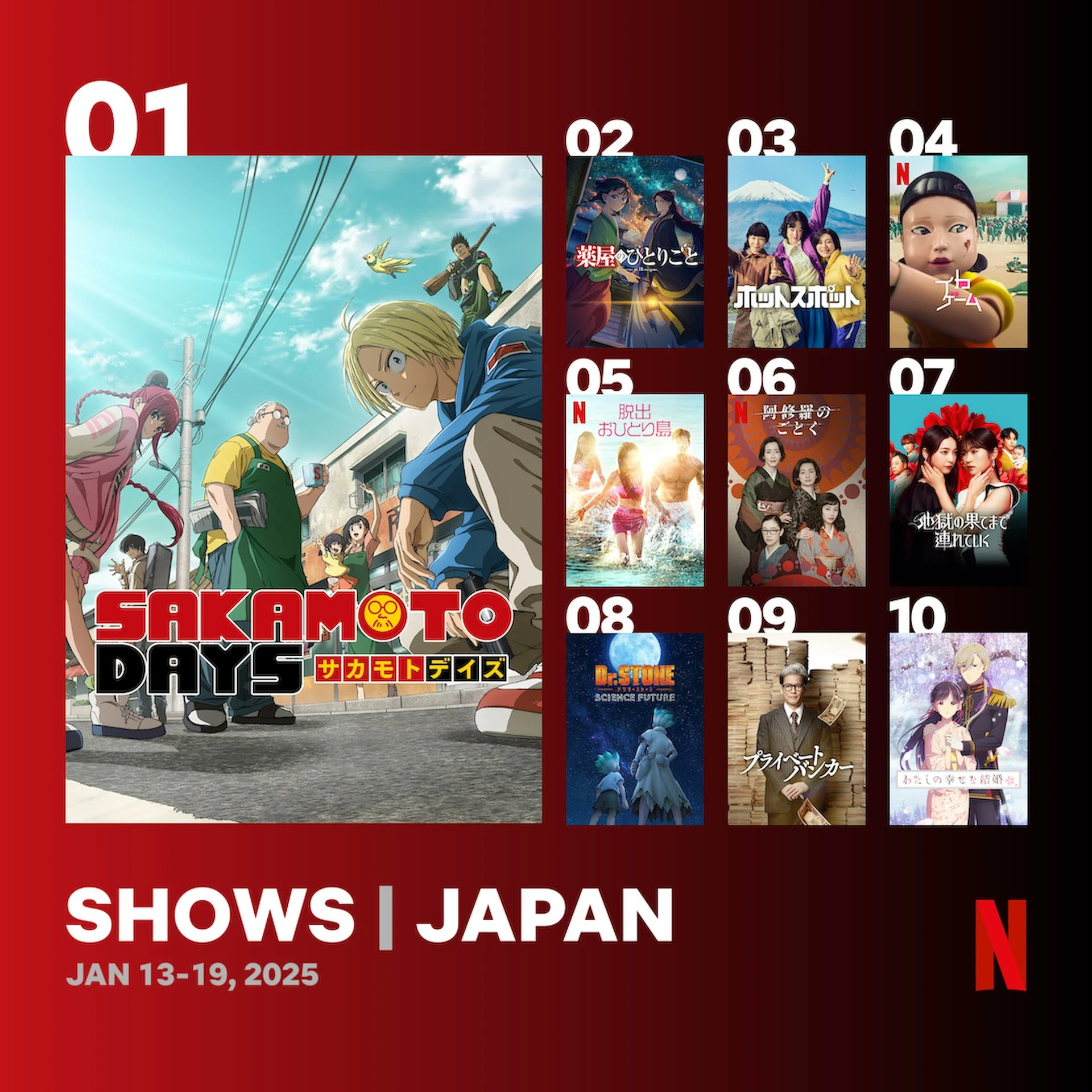 Кроме того, «Дни Сакамото» установили новый рекорд платформы, собрав ошеломляющие 8,6 миллиона просмотров за первую неделю. Ранее рекорд принадлежал «Баки Ханма» с 6 миллионами просмотров. Замыкают топ-4 «Дандадан» (4,3 миллиона) и «Драконий жемчуг Дайма» (3,2 миллиона).