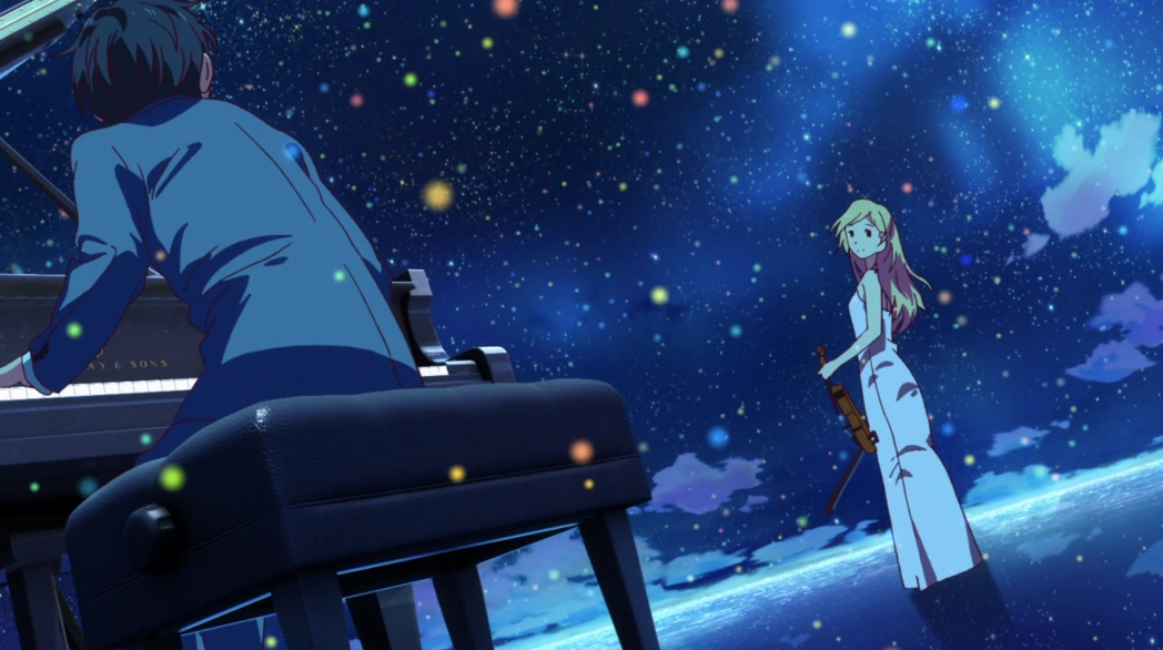 Аниме касается сложных тем, таких как психологические травмы, стресс, одиночество, любовь и смерть. История о гениальном пианисте, лишившемся слуха после трагических событий в жизни, и о его знакомстве со скрипачкой Каори. Вместе они пытаются преодолеть свои душевные травмы, ищут поддержку друг в друге, играя вместе, они учатся доверять и понимать друг друга.