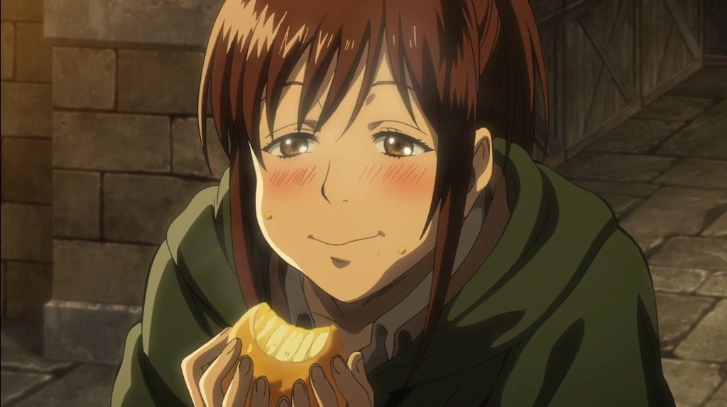 Саша пообещала друзьям, что они вместе будут праздновать, делясь мясом, как только достигнут своих целей. И вот, когда Эрен услышал её последние слова — «мясо» — его накрыла волна воспоминаний о её жизнелюбии и простоте.