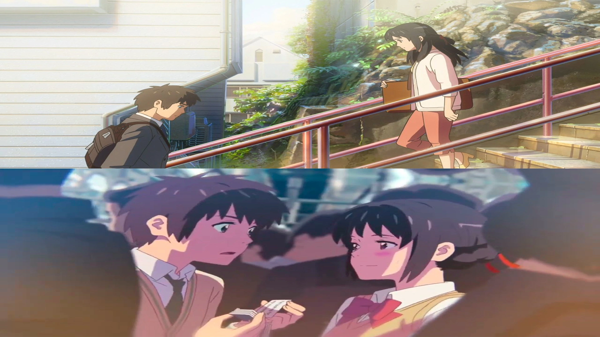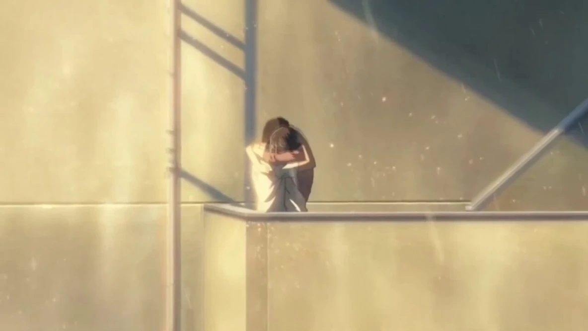 Дождь и вправду является, пожалуй, самой важной составляющей фильма. Играя на противоречии, Синкай демонстрирует самые тёплые, яркие, важные и объединяющие моменты для героев на фоне шумного, бесконечного, холодного и заливающего водопада. А первая и единственная встреча (не считая финальной сцены) Акизуки и Юкино вне огромного парка происходит в залитых согревающим летним солнцем коридорах нелюбимой для обоих школы (а для Юкино и вовсе травмирующей). И уже после, когда Акизуки подрался за честь любимой и они встречаются вновь в парке, тоже высоко светит солнце. И снова главным импульсом для ещё более глубокого и чёткого соединения их ритмов выступает дождь, выливающийся в могучий ливень. Наши герои, наконец, полностью и безвозвратно открываются друг друга, до конца. Сначала это делает Акизуки, но не встретив взаимности со стороны любимой, поспешно сбегает, выпадая из их ритма. И лишь потом, в пронзительной сцене на лестнице (Синкай уже придал им культовый статус), открывается и Юкино. Триггер для её откровения тоже символизирован дождём, однако построен на несколько отличной теме, что будет разобрана следующей.