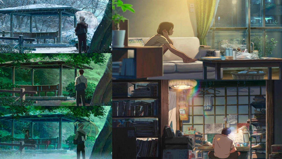 Да и в целом, не считая перебивок (магазины, станции вокзалов или на полминутки промелькнувшая квартира старшего брата Акиузки), локаций главного действа всего несколько. Первым, очевидно, будет парк (пожалуй, это ещё один почти персонаж, наравне с дождём). Заявлять, что там происходит половина всего фильма, конечно, неправильно, но он имеет у себя около трети всего хронометража и, разумеется, является важной локацией для обоих героев, служа пунктом объединения и сохранения их ритмов на протяжении всей картины.