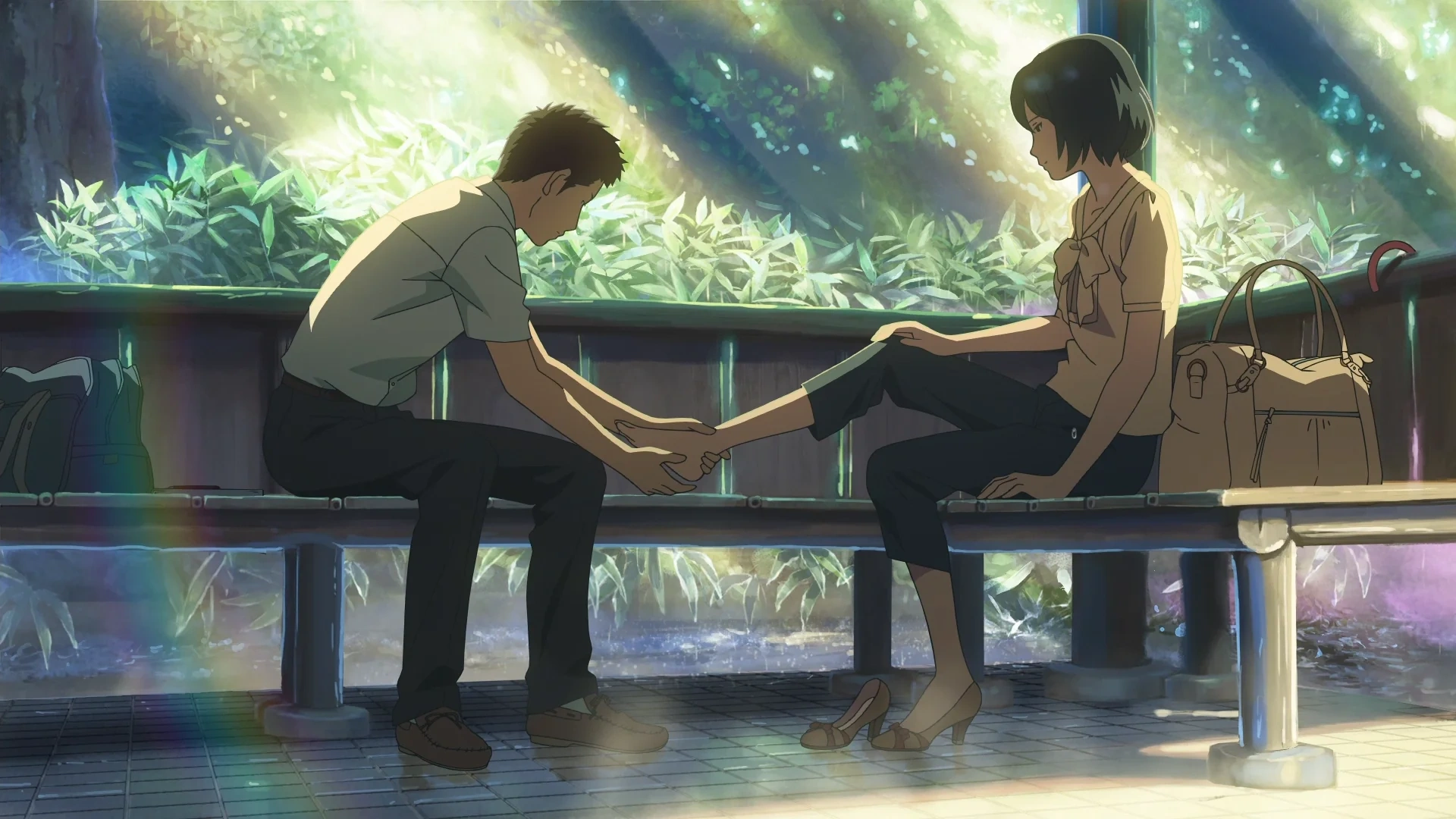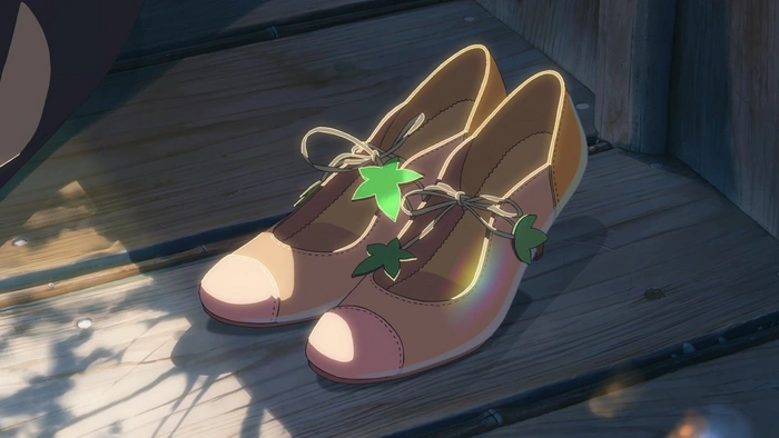 - Обувь — пути личностного роста: Обувь несет в себе символическую нагрузку в фильме, особенно для Такао. Они представляют его стремления и служат метафорой личностного роста. Сквозь свою преданность изготовлению обуви Такао стремится найти свой собственный путь в жизни, шагая вперед с решимостью. Тщательное мастерство изготовления обуви также символизирует заботу и внимание, необходимые для выращивания отношений и понимания других.