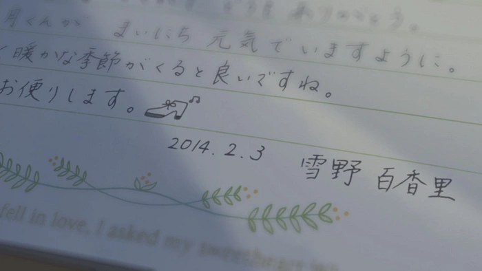 Прочитав последний абзац письма, мы можем понять что госпожа Юкино «написала такое длинное письмо, сама того не зная», поблагодарила Такао за терпение и пожелала ему всего хорошего имея надежду о скором наступлении тёплой поры.