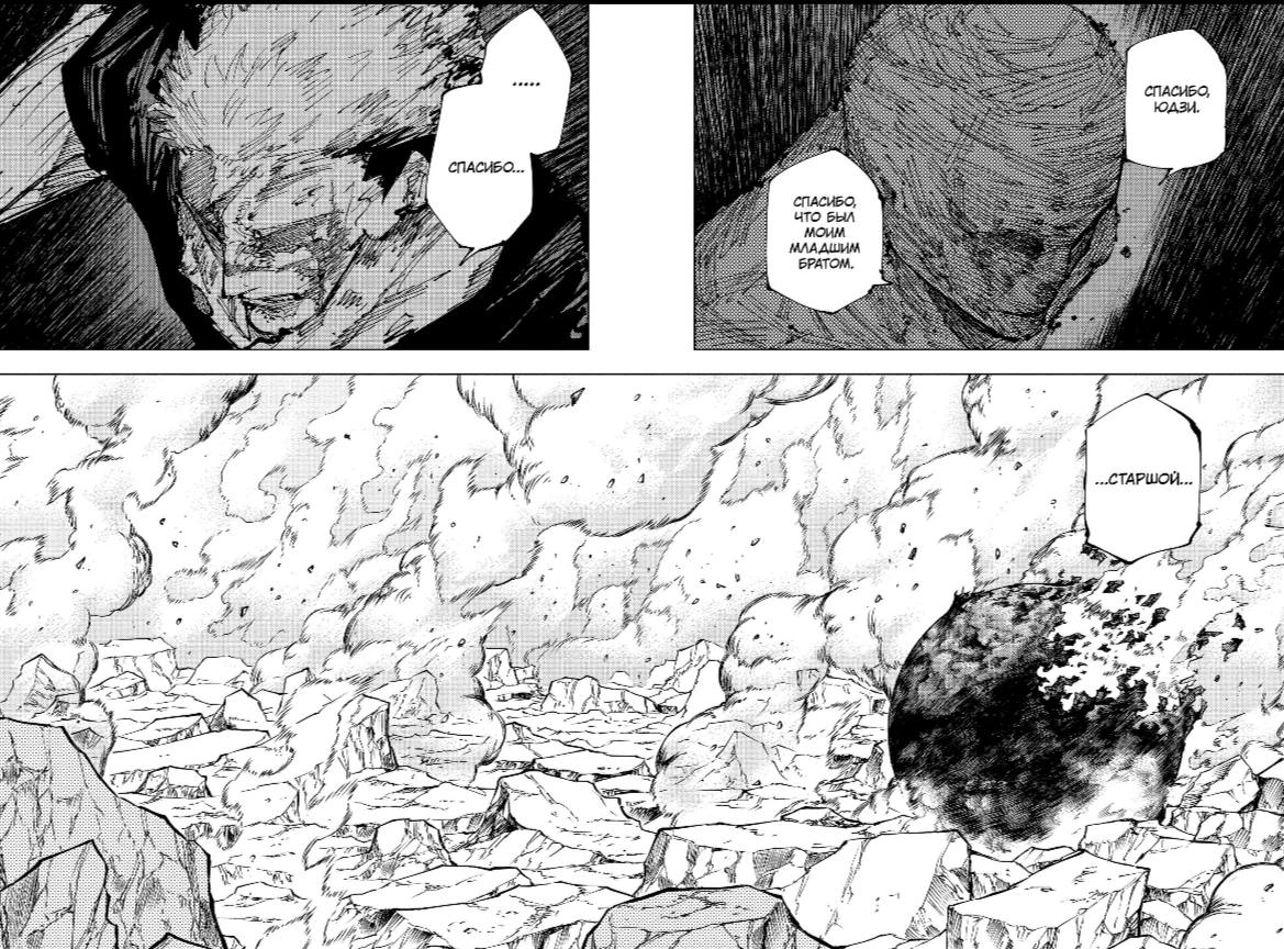 Последние слова Чосо, когда он благодарит Юджи за то, что он был его братом, просто душераздирающие, и его смерть, возможно, имела такое же влияние, как и смерть Нанами в Сибуе, если бы глава размышляла о внутреннем смятении Юдзи в тот момент. Что еще хуже, Тодо мгновенно заверяет Юдзи в том, что все «вероятно» будет хорошо, что сразу же помогает Юджи вести себя так, как будто ничего не произошло. Это кажется довольно неестественным даже для человека с таким неукротимым духом, как Юдзи.