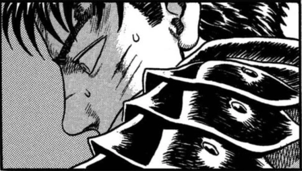 Гатс же, как настоящий японский антигерой, не из тех, кто ищет спасение в храме или читает наставления по самопомощи. Его философия проста: проблемы решаются, если у тебя достаточно большой меч, и ты достаточно упрям. Его отношения с миром — это нечто среднее между смертельным боем и мрачной балладой о выживании.